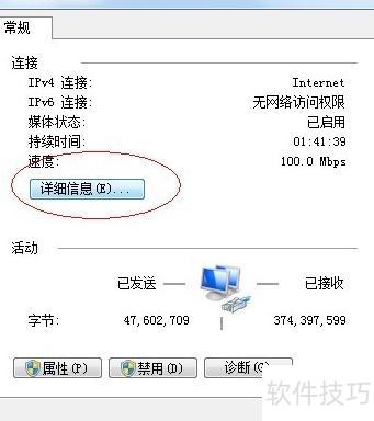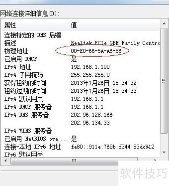 6、 在网络连接详情中查看网卡物理地址,所示,请记录该地址信息。