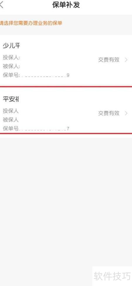 5、 进入补发页面,选择所需保单,操作所示。