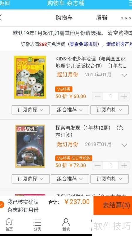 10、 请仔细核对商品数量、起订月份及金额(不含运费),可选择凑单达268或600元享受免运费优惠,确认无误后结算。杂志订阅均从下单后的下一个月开始刊发。