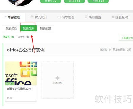1、 进入百度经验,点击内容管理,选择我的经验并切换至我的杂志页面,操作所示。