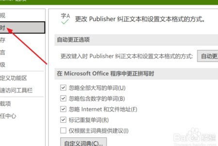 3、 在Publisher 选项窗口左侧,点击选择校对功能。