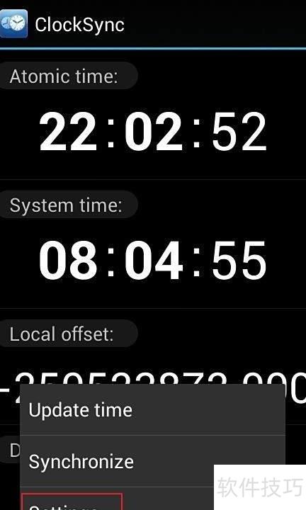 2、 打开手机菜单键,选择首个选项,此时界面中的原子钟时间与本地时间误差两项参数将随之发生相应变动。