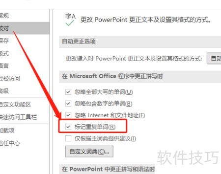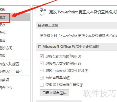 4、 在PPT设置里选择校对功能,操作见示意图。