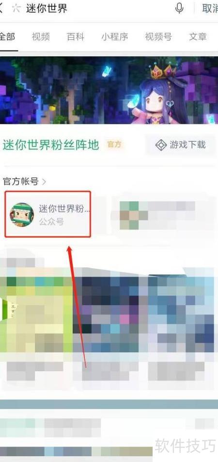 2、 进入界面,选择,输入迷你世界并搜索,随后打开相关搜索结果页面。