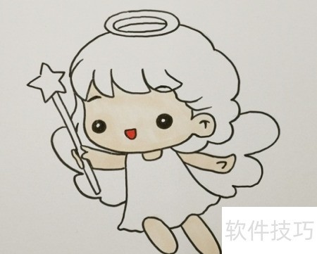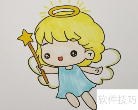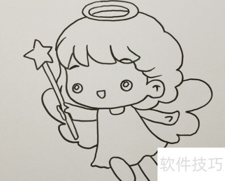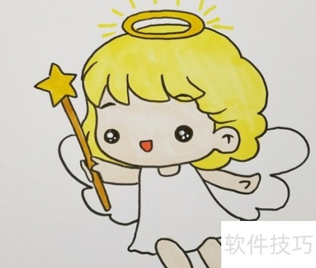 3、 在小天使身后绘出一对展开的宽大翅膀,手中握着一根顶端缀有五角星的魔法棒,整体形象充满梦幻与童趣。
