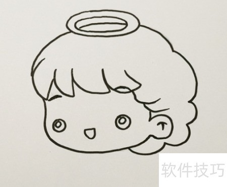 1、 先画天使的头部,头顶加上椭圆光环,再添上卷曲的头发,接着勾勒五官,眼睛圆润,嘴巴小巧可爱,整体形象生动柔和,充满童趣与梦幻感。