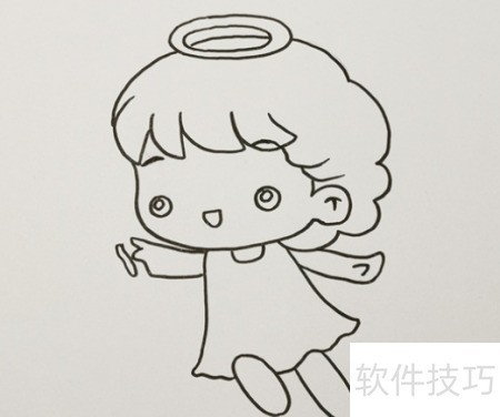2、 描绘天使的身体,双臂张开,身着可爱连衣裙,一腿微曲,呈现飞翔姿态。