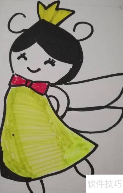 7、 将裙身涂成柠檬黄,系上红色蝴蝶结,作品完成。