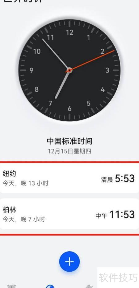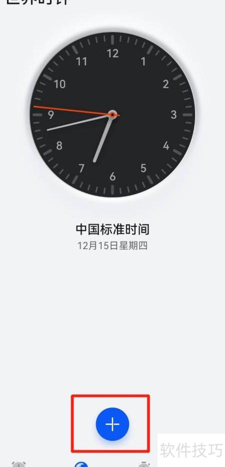 2、 打开手机时钟应用,点击底部+号添加新功能。