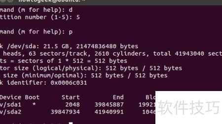 14、 使用d命令可删除分区,系统会提示输入要删除的分区编号,该编号可通过p命令查看。例如,若要删除/dev/sda5分区,只需输入编号5即可完成操作。