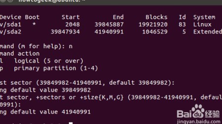 17、 使用n命令可新建分区,选择l创建逻辑分区或p创建主分区,注意每块磁盘最多支持四个主分区。