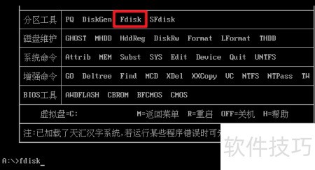 2、 在增强DOS界面中,分区工具包含Fdisk,只需在光标位置输入Fdisk并按回车键即可启动该程序。