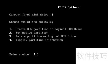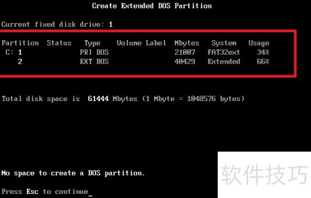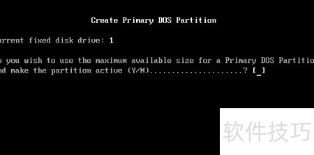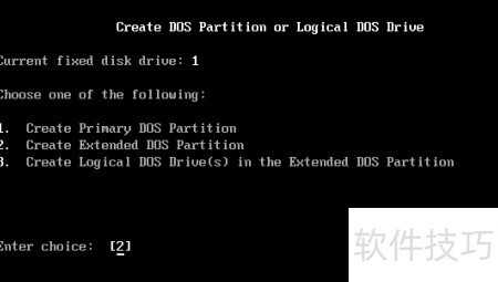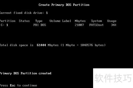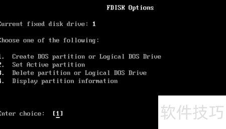 17、 完成主分区后,按下ESC键返回Fdisk功能选择界面,选择第一项即可进入分区功能。