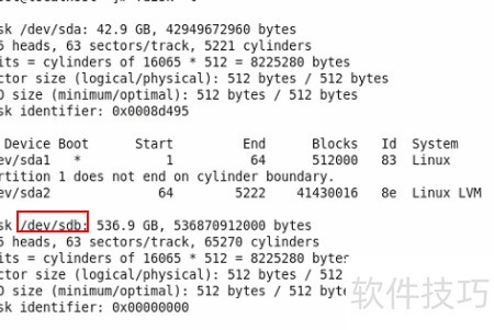 2、 通过fdisk -l命令查看新添加的500G硬盘信息