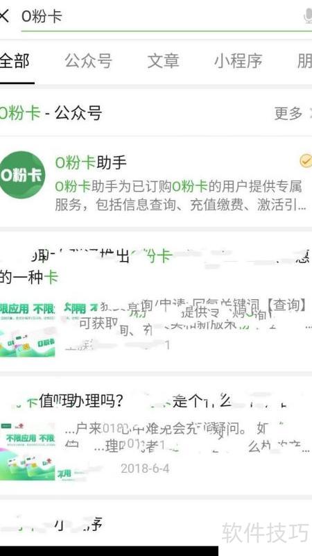 1、 打开微信搜索天神卡,即可找到O粉卡助手公众号。