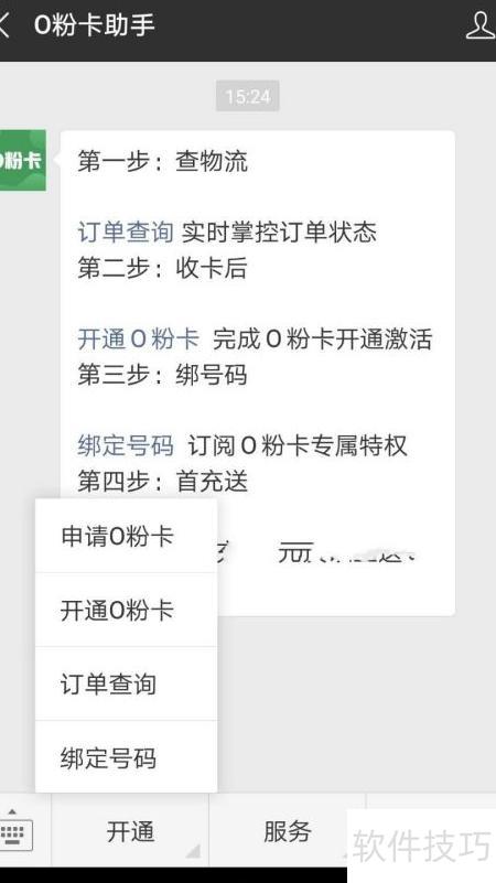 3、 进入O粉卡助手公众号消息页面,将弹出办理说明,菜单栏设有开通服务和福利选项。