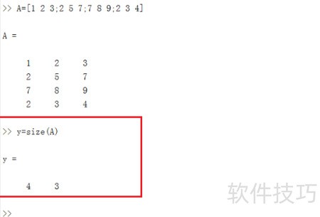 2、 在命令行中输入 y=size(A) 并回车,结果显示 y 为 4 和 3,说明当 size() 函数仅有一个输入参数时,会返回该矩阵的行数与列数,具体结果所示。