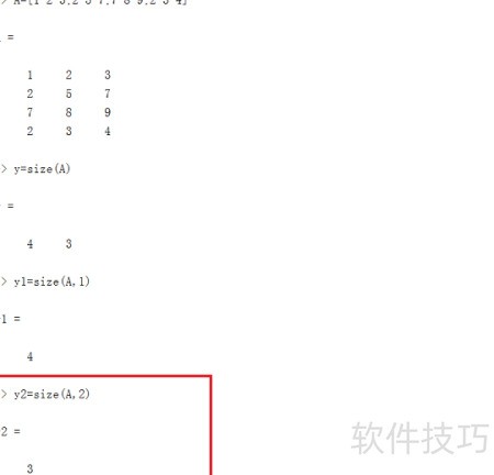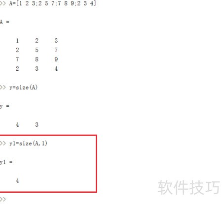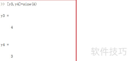 5、 当有两个输出参数时,可分别获取矩阵的行数和列数。在命令行中输入size(A),回车后,y3返回行数,y4返回列数,具体结果所示。