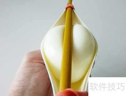 3、 将纸板对折,确保两边高度低于鸡蛋,把鸡蛋竖立放在中间,放上筷子并下压,再用皮筋将筷子和纸板捆紧,静置冷却后即可定型。