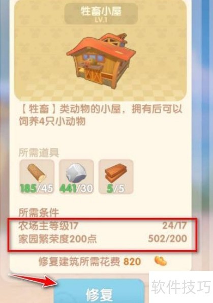 前往摩尔庄园的摩尔城堡,与汤米对话后到建筑商店选取畜牧小屋,满足相应条件便可完成修复。