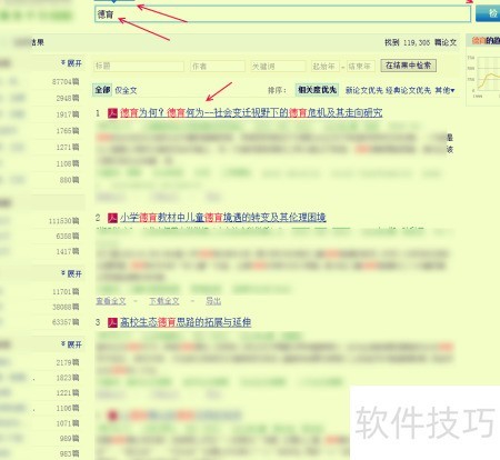6、 在搜索框内输入论文关键词,建议使用两字以上且能准确表达主题的内容,避免过长。以德育为例进行检索,确保信息清晰明确,便于查找相关文献资料。