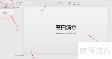 5、 软件界面功能布局所示:菜单栏与工具栏提供幻灯片制作所需工具,预览区支持幻灯片的增删及页面切换,编辑区为具体设计区域,备注栏则用于输入对当前页面的补充说明文字。