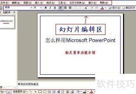 2、 打开后即进入PowerPoint 2003的编辑界面,所示。顶部菜单栏包含文件、编辑、视图、插入、格式、工具、幻灯片放映、窗口和帮助九大功能模块,接下来将对各个功能逐一进行简要说明。