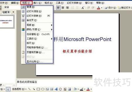 5、 视图菜单包含普通、幻灯片浏览、工具、页眉页脚等功能选项,所示。