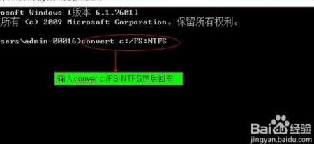2、 打开命令窗口后,输入 convert disk:/FS:NTFS(disk:表示驱动器盘符,不区分大小写),然后按回车执行。注意convert后需留一个空格。例如输入 convert f:/FS:NTFS,即可将F盘格式转换为NTFS,操作效果所示。
