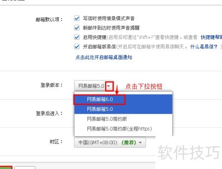 5、 点击登录版本右侧的下拉箭头,选择网易邮箱6.0,最后点击底部的保存按钮完成设置。