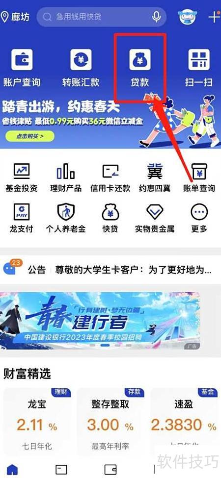 1、 打开建行APP,选择贷款选项即可。