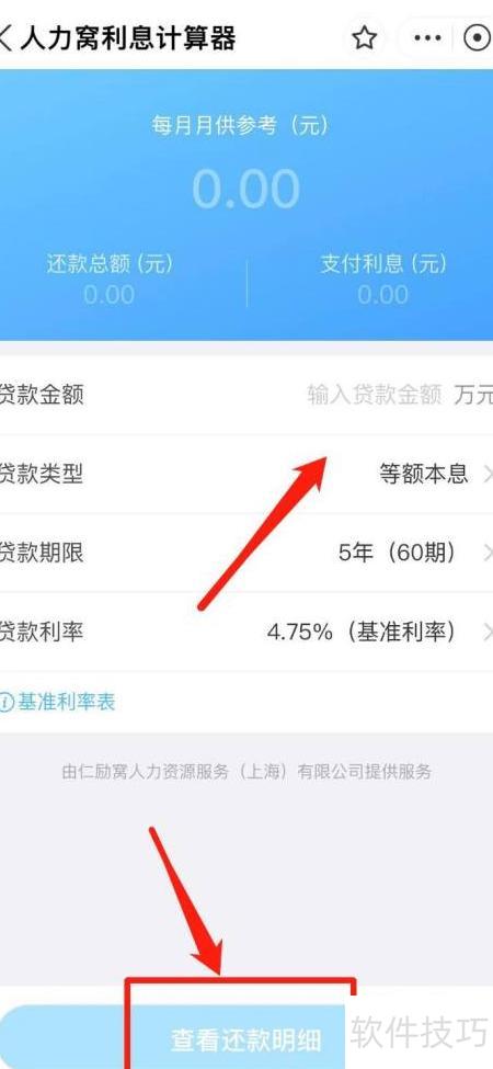 3、 在利息计算器中输入贷款金额与4.2%年利率,点击查看还款明细即可得出利息结果。