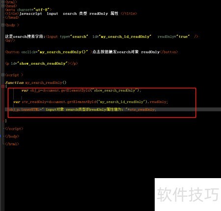 6、 在自定义函数中获取输入搜索对象,通过readonly属性读取其值,并将结果动态添加至p标签内展示。