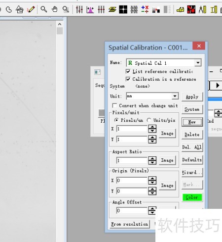 4、 读取后将显示如下界面,可进行图像对比度调节等处理。随后进行标定,依次点击measure、calibration、spacial,选择new即可完成新建标定操作。整个过程直观便捷,便于后续分析使用。