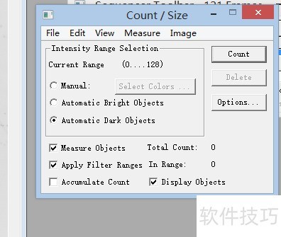 7、 点击measure中的count/size,可对图像中的图案进行数量统计。选择track objects功能,则能追踪视频中物体的运动轨迹及相关参数,实现动态分析与数据提取。