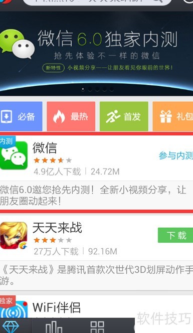 1、 想体验微信6.0内测版,需先在手机安装,因该版本仅通过应用宝首发并提供下载。