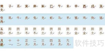8、 十二地支对应月份、生肖及阴阳五行,体现传统历法与命理的关联。