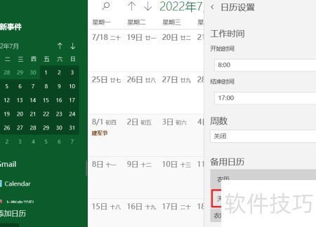 3、 滚动页面,在备用日历中启用并选择农历选项。