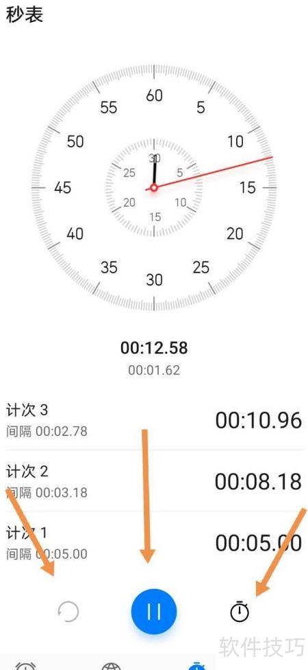 3、 点击开始按钮启动计时,左侧按键用于重新开始,右侧按键实现计次功能。例如测试全班跑步成绩时,可依次记录每位同学的用时,方便快捷,具体操作所示。