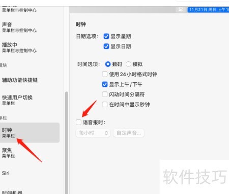 3、 进入程序坞与菜单栏设置,选择时钟并启用语音报时功能。