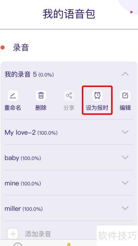4、 完成录音后返回上页,点击设为报时图标,即可应用新录制的音频。