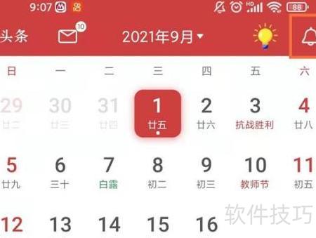 1、 打开万年历应用,点击日历右上方提醒图标。