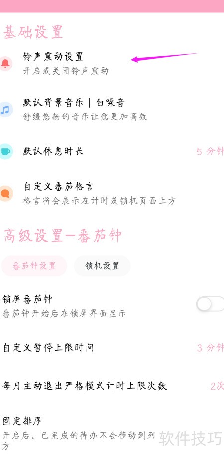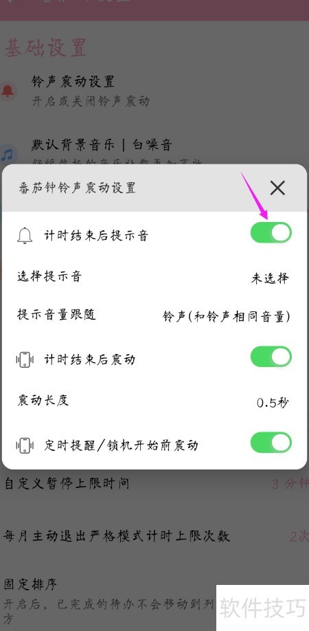 2、 在番茄钟铃声震动设置中,关闭计时结束提示音选项即可取消提示音。