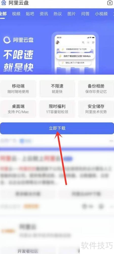 1、 打开百度APP,搜索阿里云盘,点击顶部按钮即可。