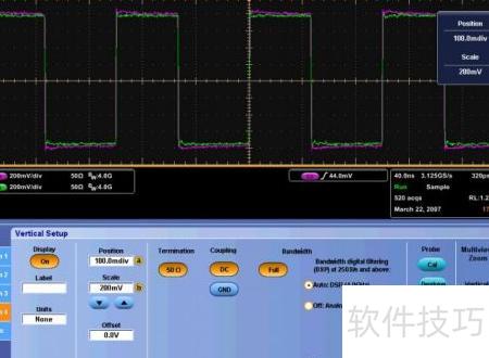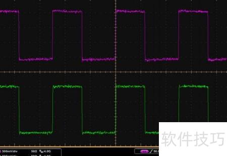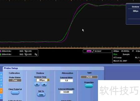 1、 将两个不同探头同时接入同一快速边沿信号,测量其时间偏差,再通过垂直菜单中的去偏斜功能,根据测得数值进行调节,使两者信号对齐一致。