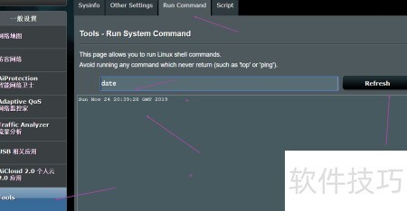 5、 在左侧工具栏中找到并选择运行命令功能,输入 date 或 date -R,即可查看路由器的系统时间。