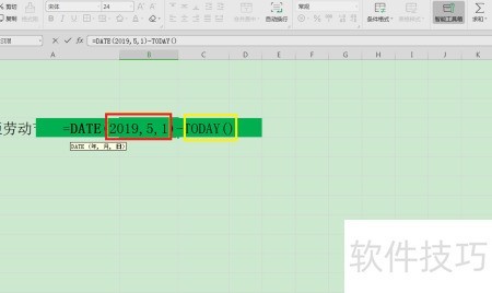 2、 在B4单元格输入公式:=DATE(2019,5,1)-TODAY(),用于计算指定日期与当前日期之间的天数差。