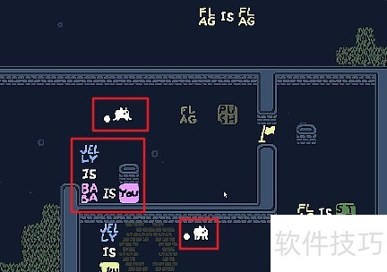 13、 通过规则组合JELLY IS BABA与BABA IS YOU,水母获得巴巴兔的能力,变为可操控角色。图中两只巴巴兔均可由玩家控制,实现双角色同步操作。