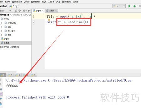 11、 打开文件a.txt,以只读模式读取其中内容,随后调用readline()方法逐行读取文件中的文本信息。