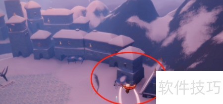 2、 进入圆梦村后向下滑行,飞至前方有棚屋后方,即可发现隐藏在那里的向导先祖。